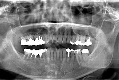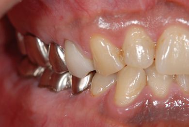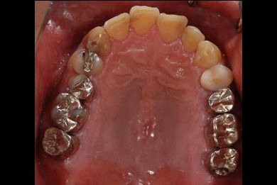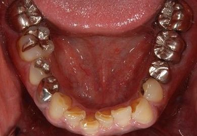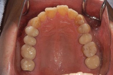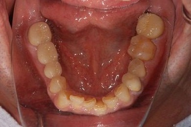 | 治療内容 | インプラント2本、メタルボンドセラミッククラウン9本(メタルボンド用土台6本)、ハイブリッドセラミッククラウン2本(セラミック用土台2本)、ハイブリッドセラミックインレー5本、歯肉歯槽骨整形術 | ||||||||||||||||||||||||||||||||