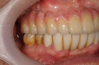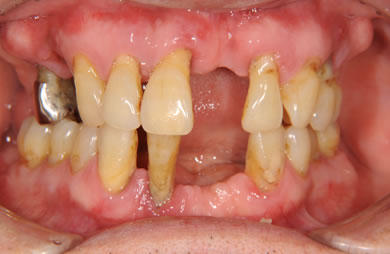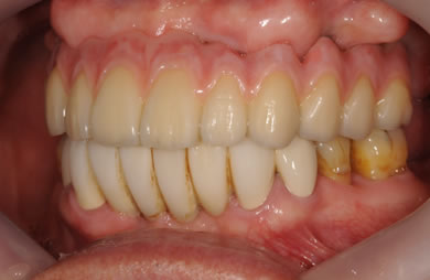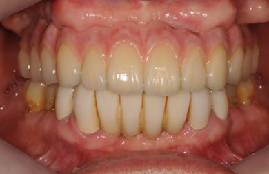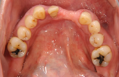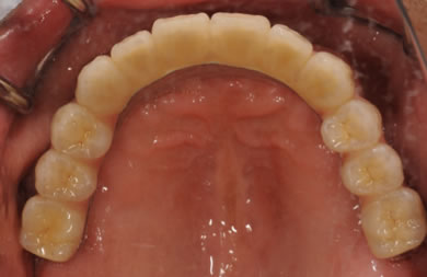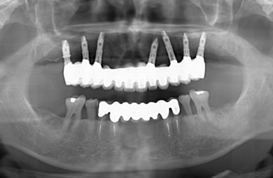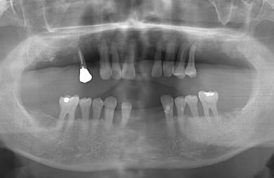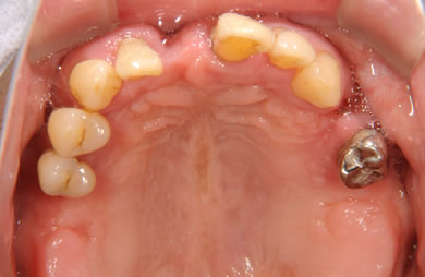 | 治療方針 | ソケットリフト法により上顎洞底部を拳上することにより、骨の無い部分に骨をつくってあげ、インプラント治療を可能にする。さらに歯周病により組織の破壊が著しいので、AGC連結セラミック治療により上顎の審美的回復を行う。 | ||||||||||||||||||||||||||||||||