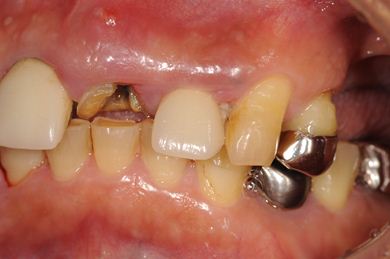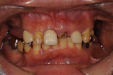 | 治療方針 | 右上奥はソケットリフトにて上顎洞拳上してインプラント埋入を可能にし、上顎前歯部は骨再生法によりインプラント治療を行う。その他、補綴により口腔内全体の機能的審美的回復を行う。 | ||||||||||||||||||||||||||||||||
