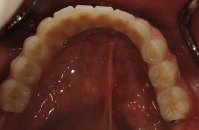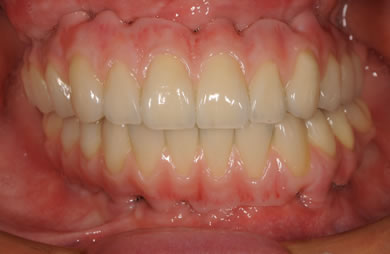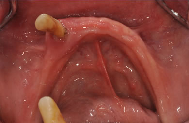 | 治療方針 | 骨再生療法にて骨量を回復するとともに軟組織も移植し、機能的回復だけでなく審美的回復も行う。 | ||||||||||||||||||||||||||||||||