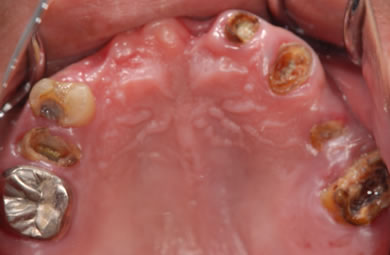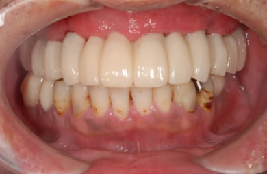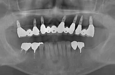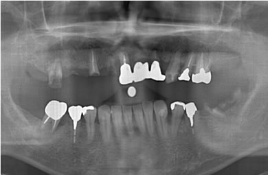 | 治療方針 | 骨再生療法にて上顎の骨を増やしインプラント治療にて審美的・機能的回復を行う。 | ||||||||||||||||||||||||||||||||